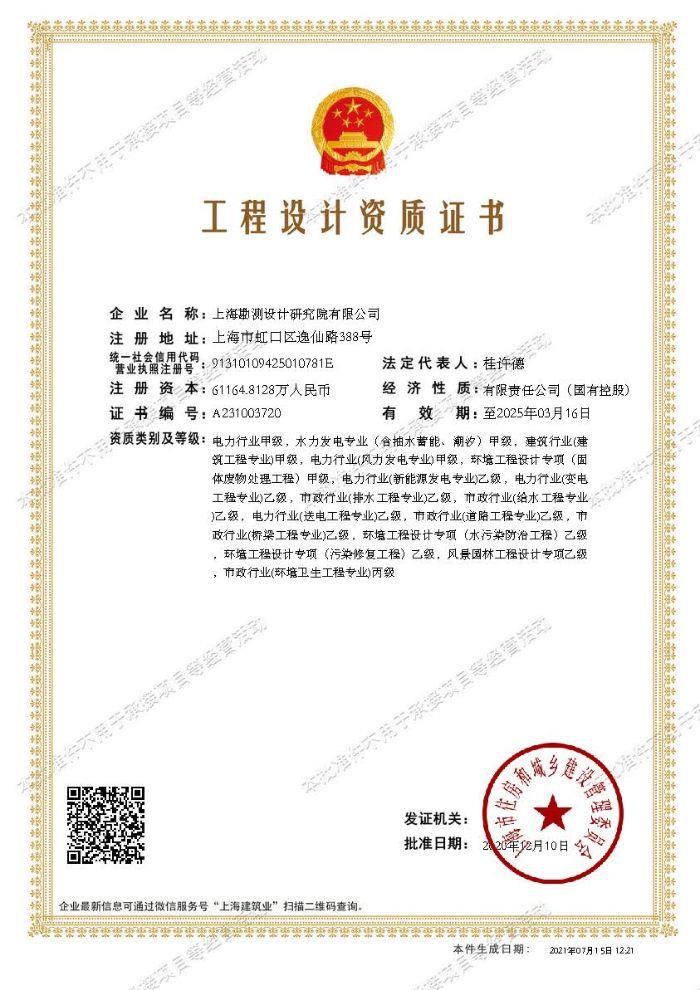 工程設計資質證書:建筑行業(建筑工程專業)甲級;環境工程設計專項(固體廢物處理工程)甲級;